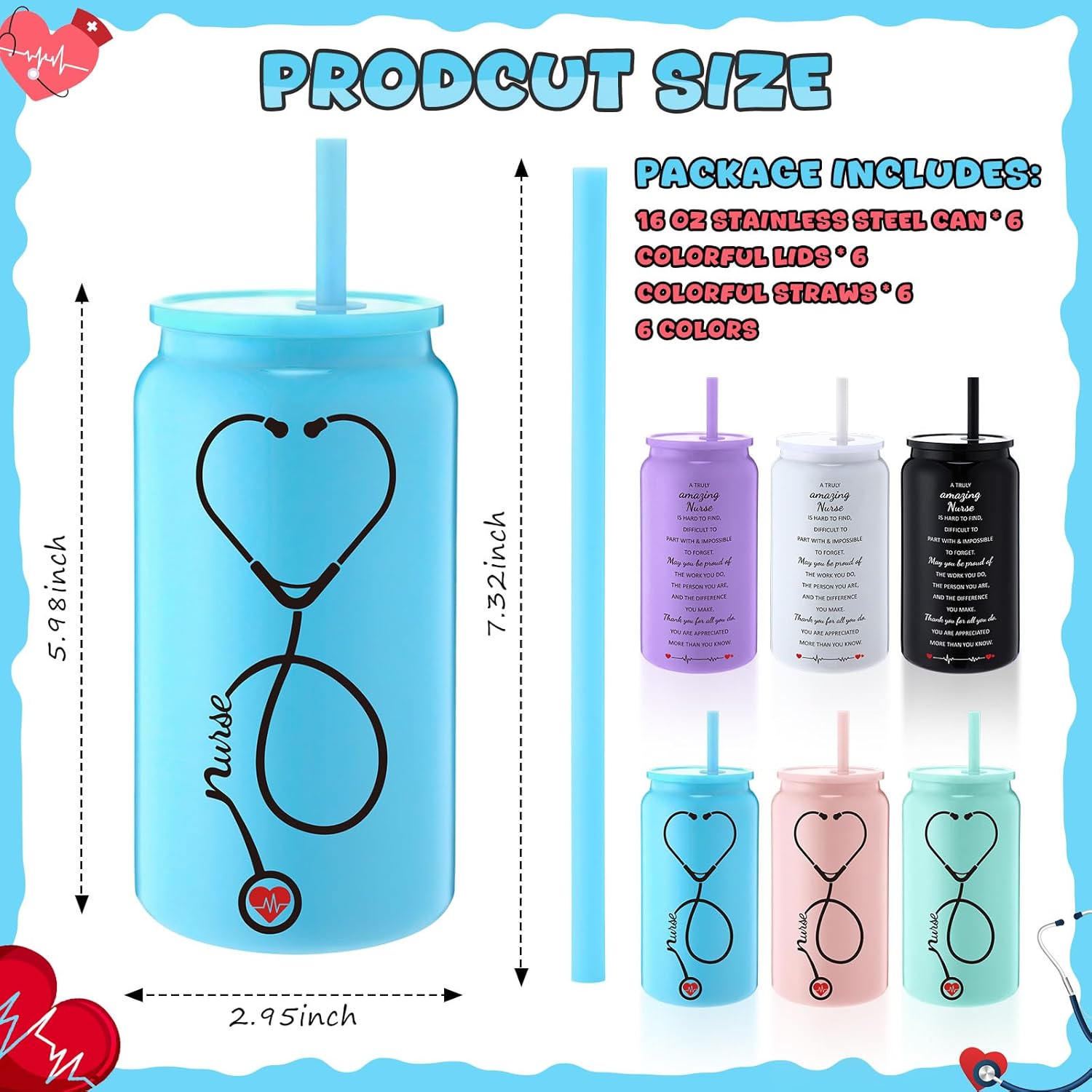 Feature: Wide Application: These women's nurse tumblers are exquisite and beautiful in appearance and can be widely applied for travel, picnics, camping, boating, walking, cycling, hiking, and other outdoor activities. They are also suitable for homes, offices, meeting rooms, and shops. Versatile for multiple scenarios: This 16-ounce stainless steel cup is suitable for a variety of beverages, such as tea, coffee, soda, and other hot and cold drinks. It's also perfect for various occasions, including home, office, parties, or outdoor activities, meeting all your drinking needs. Specifications: Material: stainless Steel Color: as shown in the figure Size: about 5.98 x 2.95 inch/ 15.2 x 7.5 cm Package include: 6 x Stainless Steel Cups Warm notes: Please allow slight size error due to manual measurement. The colors may exist slight difference due to different screen
