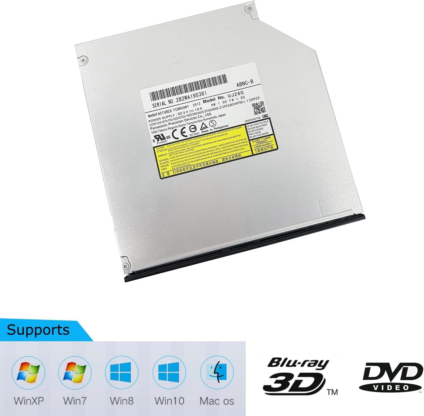 UJ-260 UJ260 6x Blu-RAY BD-RE DVD Rewriter Internal 12.7mm Sata Laptop Drive with Bezel for Dell Optiplex 7020 3060 3050 and for HP Pavilion dv4 dv5 dv6 dv7 dv8 100% NEW and Never used Manufacturer P/N: UJ-260 Category: Laptop DVD/BD Item Code: UJ-260 Height: 12.7mm (does not fit 9.5mm drive) For All Laptop/Notebook that confirms to the Blu-Ray Standard Read Speed 2x BD-ROM (Blu-Ray Read) 24x CD 8x DVD 5x DVD-RAM Write Speed: 24x CDR 16x CDRW 8x DVD-R 8x DVD+R 6x DVD-RW 8x DVD+RW 6x DL-R 6x DL+R 5x DVD-RAM 6x BD-R SL (Blu-ray Write Single Layer) 6x BD-R DL (Blue-ray Write Dual Layer) 4x BD-R TL (Blu-ray Write Triple Layer) 4x BD-R QL (Blu-ray Write Quad Layer) 2x BD-RE SL (Blu-ray ReWrite Single Layer) 2x BD-RE DL (Blue-ray ReWrite Dual Layer) 2x BD-RE TL (Blu-ray ReWrite Triple Layer) NOTE: Drive Only: Cables, Mounting Screws, and Software Not Included Package includes: 1 X UJ-260